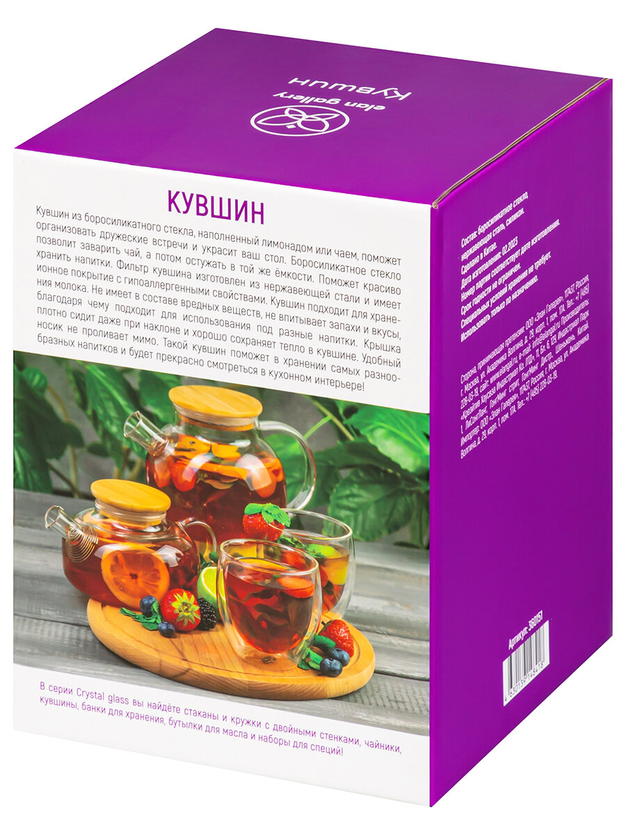 | Дополнительная информация | Кувшин "Crystal glass" 18*13*19,5 см, 1,8 л, серебро, с металлической крышкой с фильтром и с силиконовым уплотнителем, высота без крышки - 19 см, боросиликатное стекло с ионным покрытием |