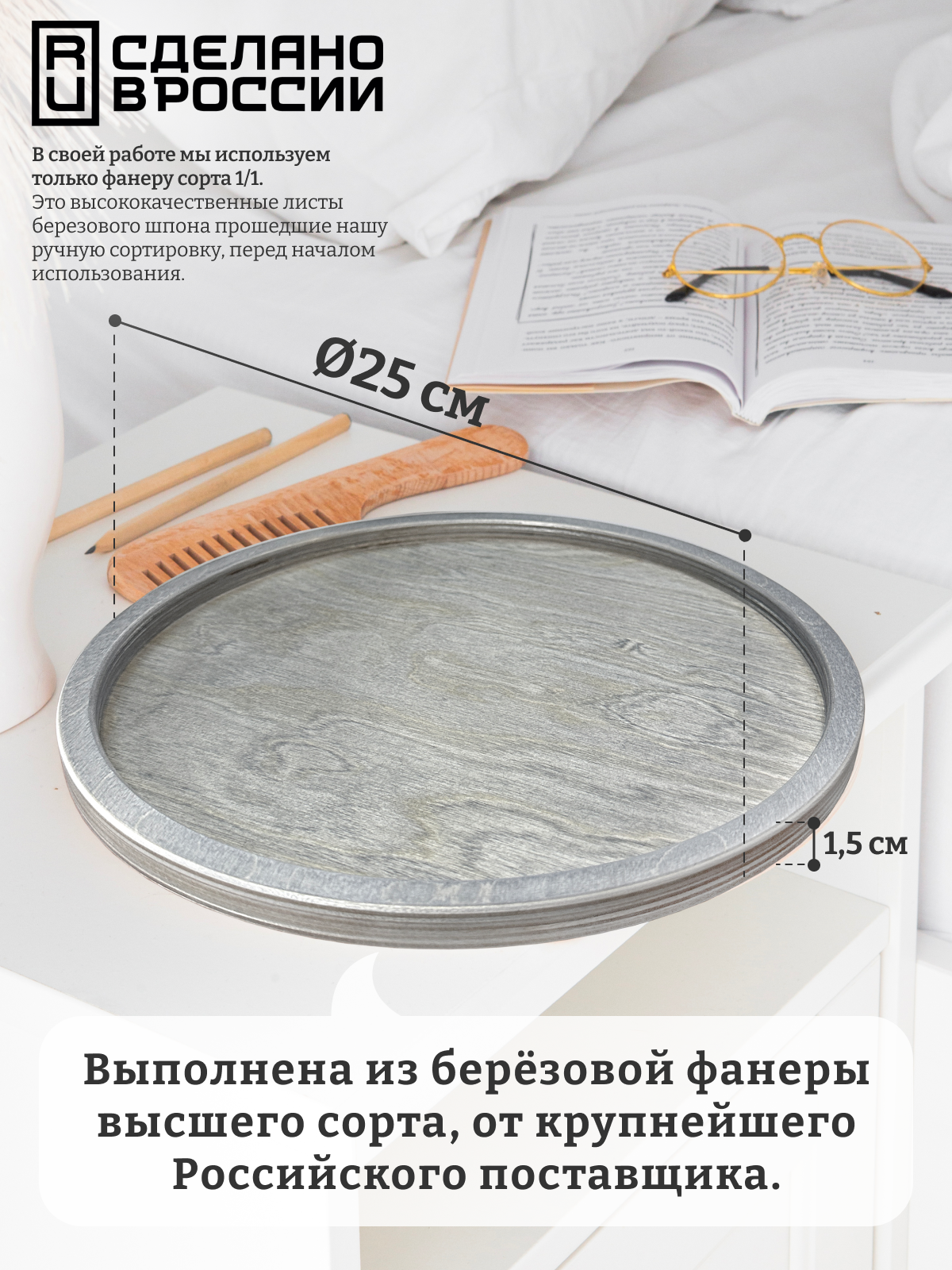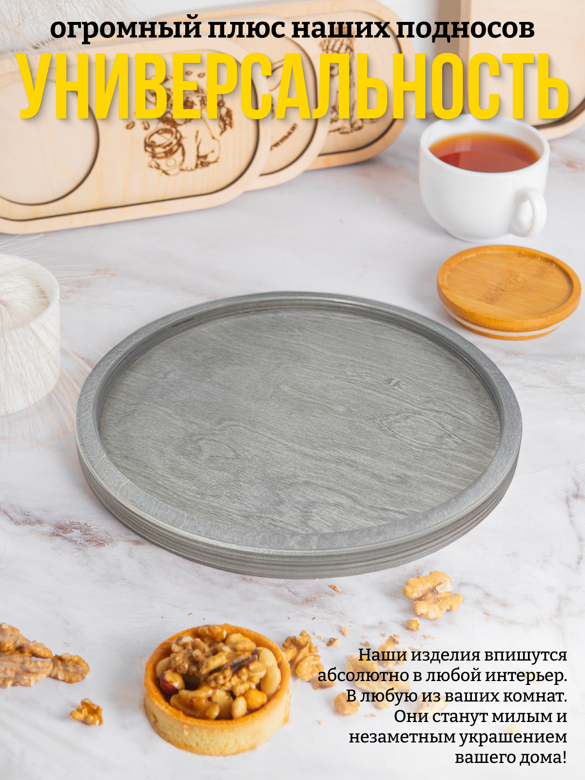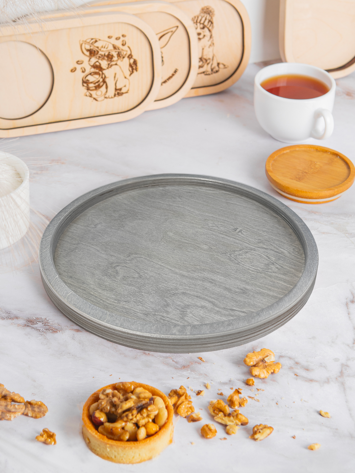 Круглый поднос деревянный 25 см - покрытие цвет "Серо-голубой" интересное: