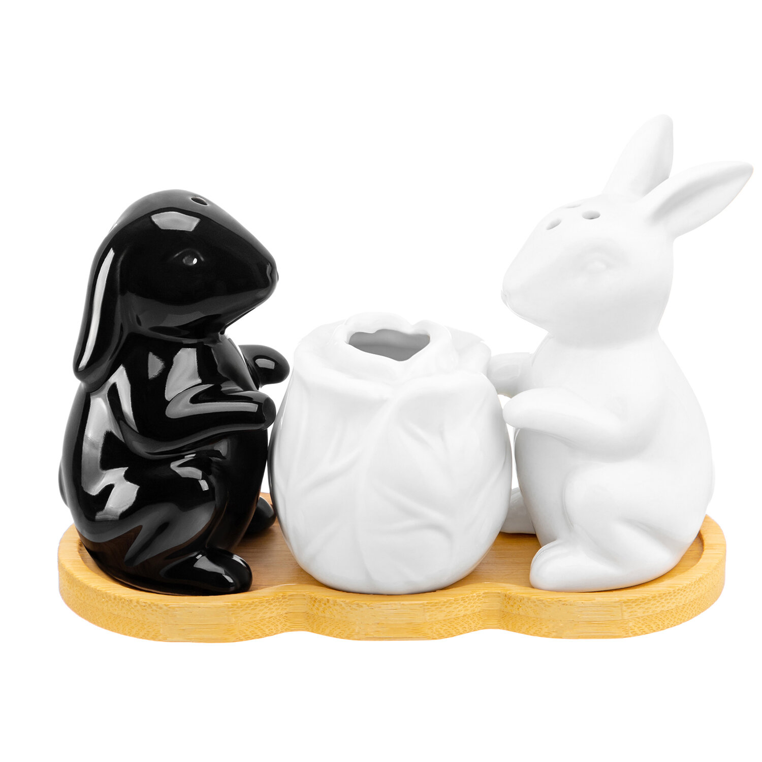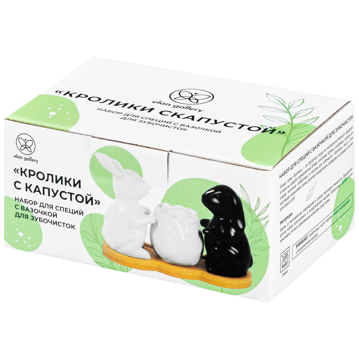 | Дополнительная информация | Набор для специй "Кролики с капустой" 3 предмета, бело-черный, солонка 5х4,5х9 см 45 мл, перечница 4,8х4,8х8 см 45 мл, вазочка для зубочисток 5,2х5,2х5,2 см 50 мл, на деревянной подставке 14х6х1 см, с зубочистками в комплекте |