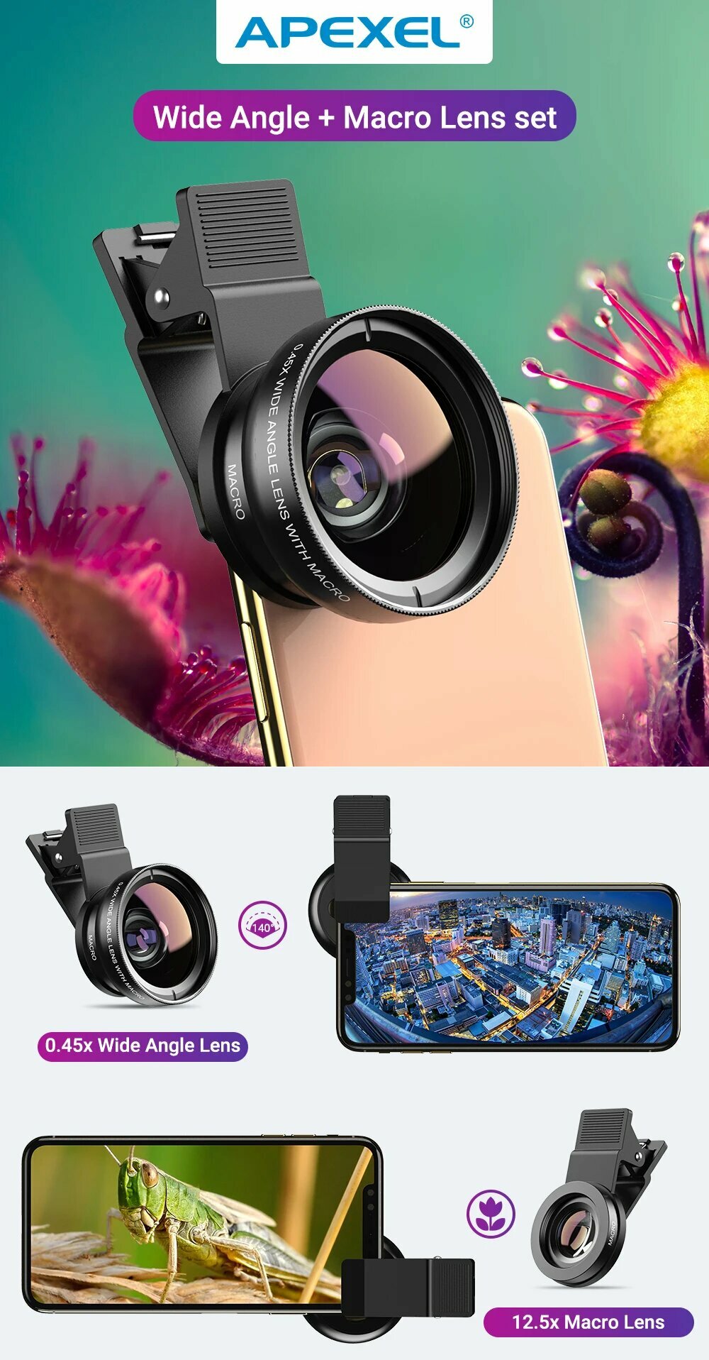 Объектив APEXEL 2 в 1, 0,45x, широкоугольный + 12,5x макрообъектив, BLACK