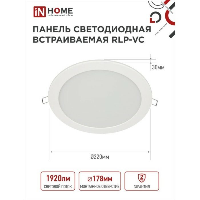Встраиваемая светодиодная панель IN Home круглая Rlp-vc 24Вт 230В 4000К 1920Лм 220мм белая IP40 4690 .