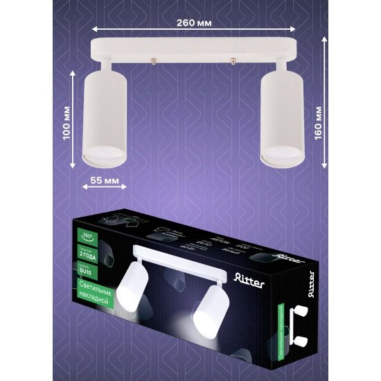 Купить Накладной светильник Ritter , Arton, поворотный, цилиндр, 260x55x160мм, 2хGU10, алюминий, белый, 59989 0,