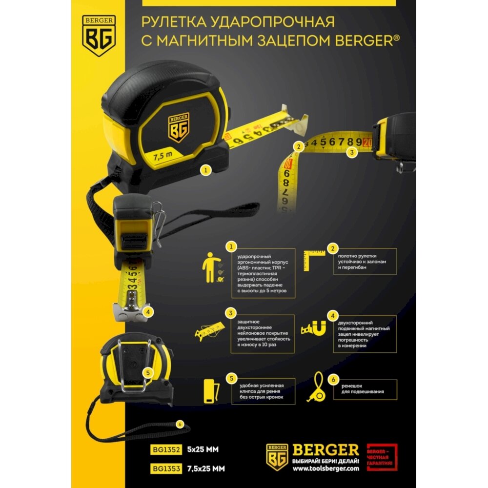 Рулетка BERGER ударопрочная, 5 м, 25 мм, с магнитным зацепом (BG1352)