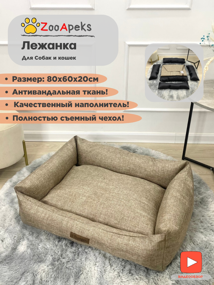 Лежак-диван для собак, для кошек, для животных средних больших пород, съемный чехол, рогожка, цвет льняной 100х70х30 см ZooApeks