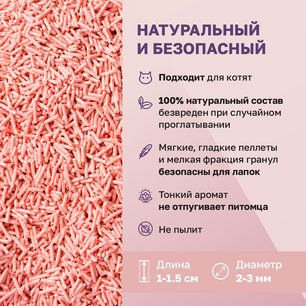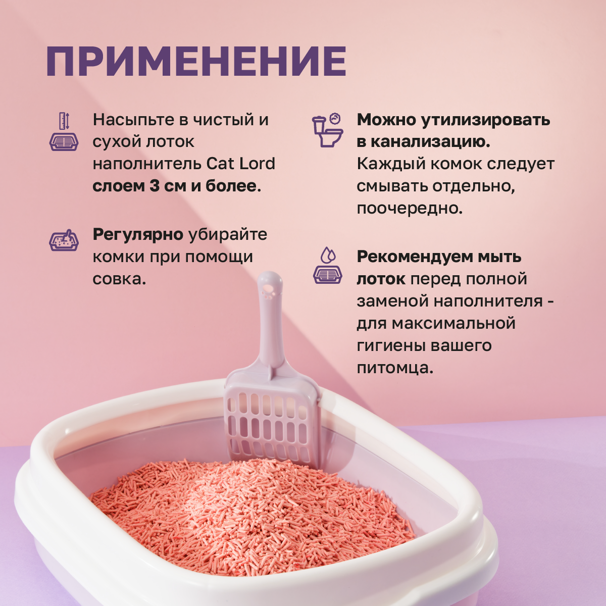 | Особенности | ароматизированный / биоразлагаемый / возможность утилизации в канализации / гранулированный / для длинношерстных / для котят / контроль запаха / с защитой от запаха / смываемый |