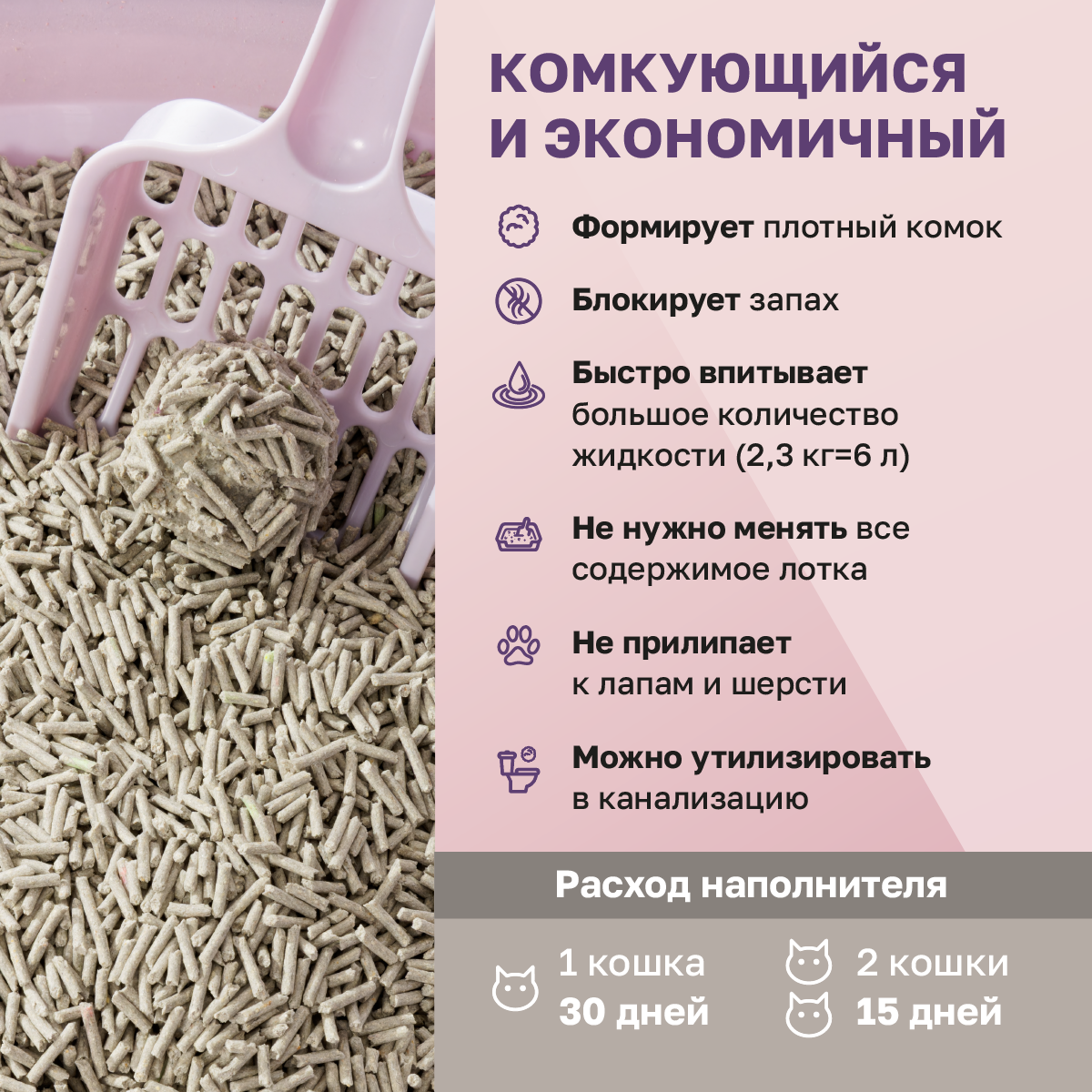 | Особенности | ароматизированный / биоразлагаемый / возможность утилизации в канализации / гранулированный / для длинношерстных / для котят / контроль запаха / с защитой от запаха / смываемый |