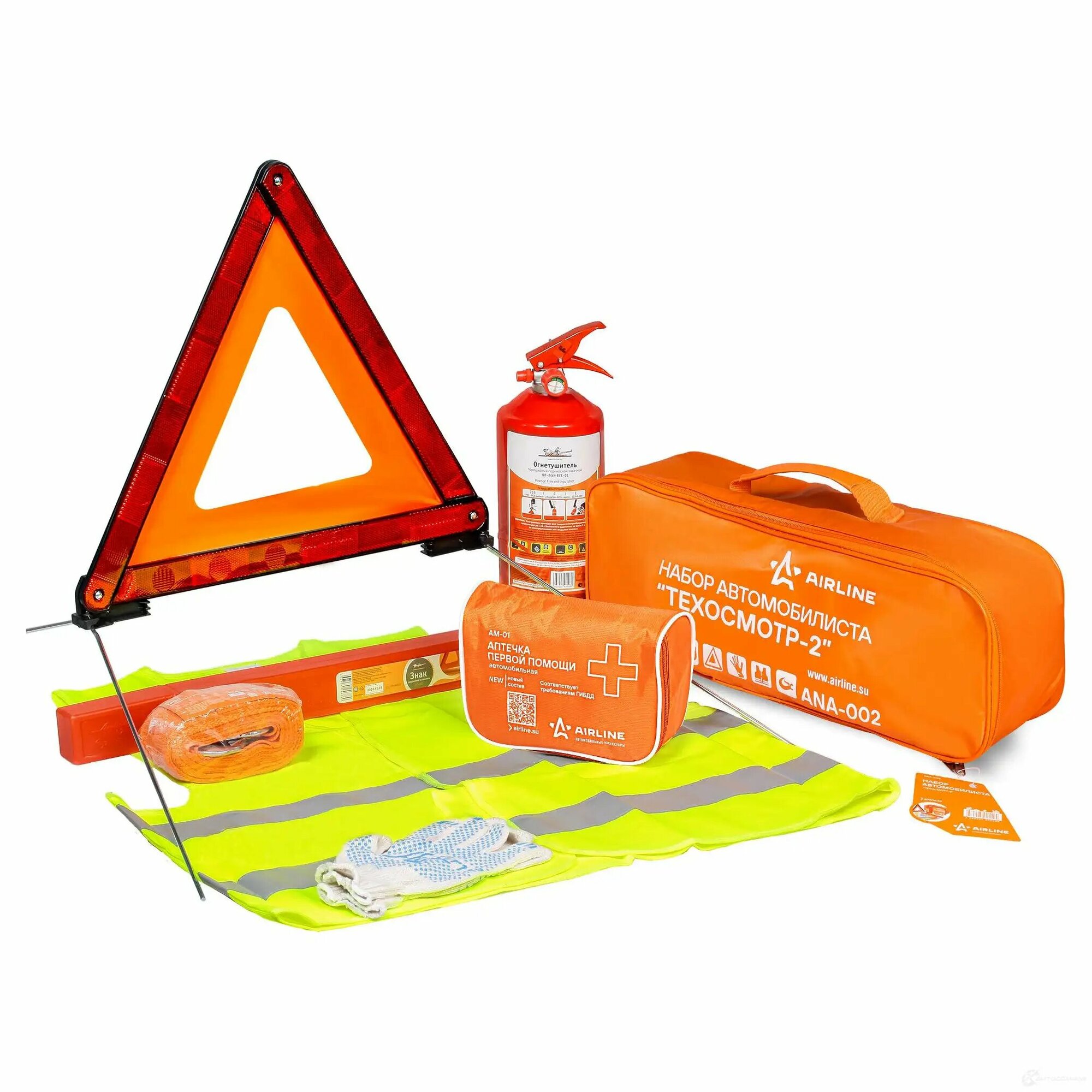 Набор автомобилиста Техосмотр-2 (Знак; Аптечка; Огнетушитель 2кг; Перчатки; Трос; Жилет)