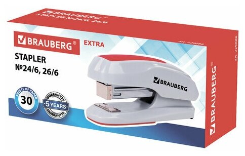 Степлер канцелярский для бумаги №24/6, 26/6 Brauberg Extra, до 30 листов, серо-красный, 229088