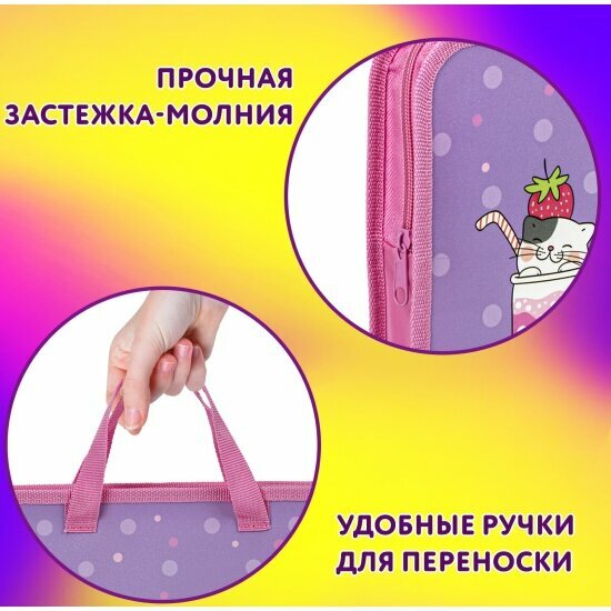 Папка для тетрадей, труда, рисования и изо А4 для девочек на молнии с ручками, канцелярия для школы, 1 отд пластик 45 мм, Юнландия Cat gang, 272148