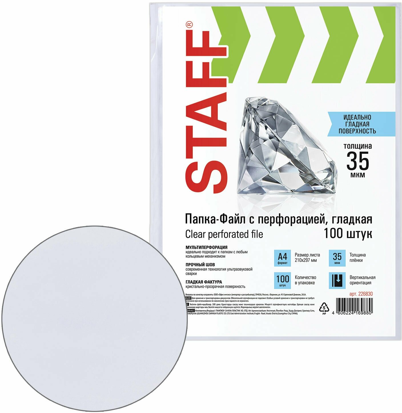 Папки-файлы перфорированные А4 STAFF, комплект 100 шт., гладкие, 35 мкм, 226830