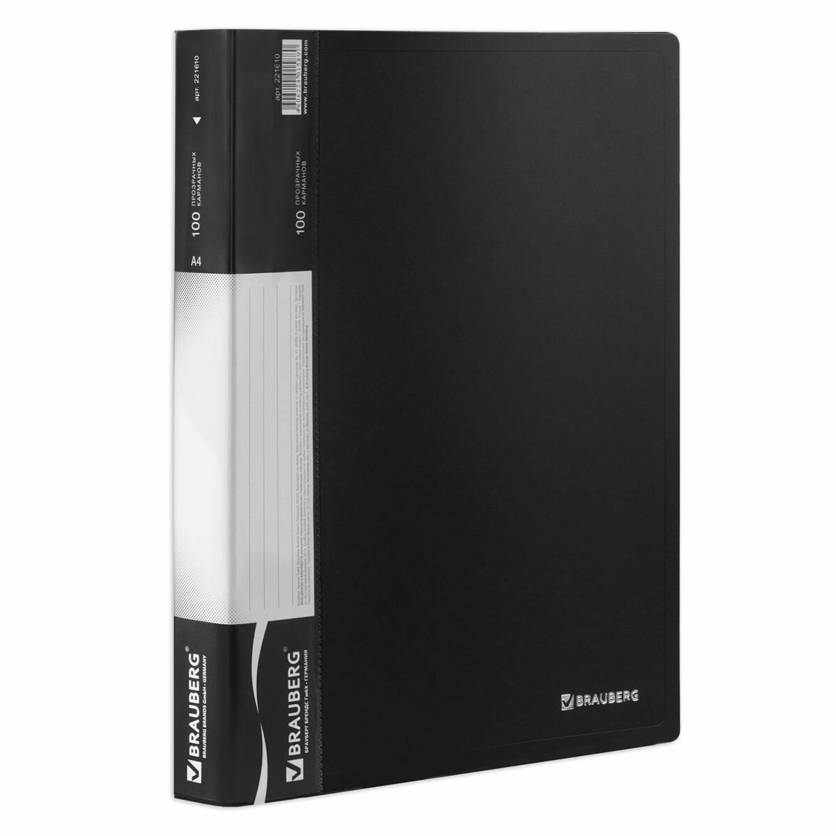 Папка для документов и бумаг канцелярская 100 файлов-вкладышей Brauberg стандарт, черная, 0,9 мм, 221610