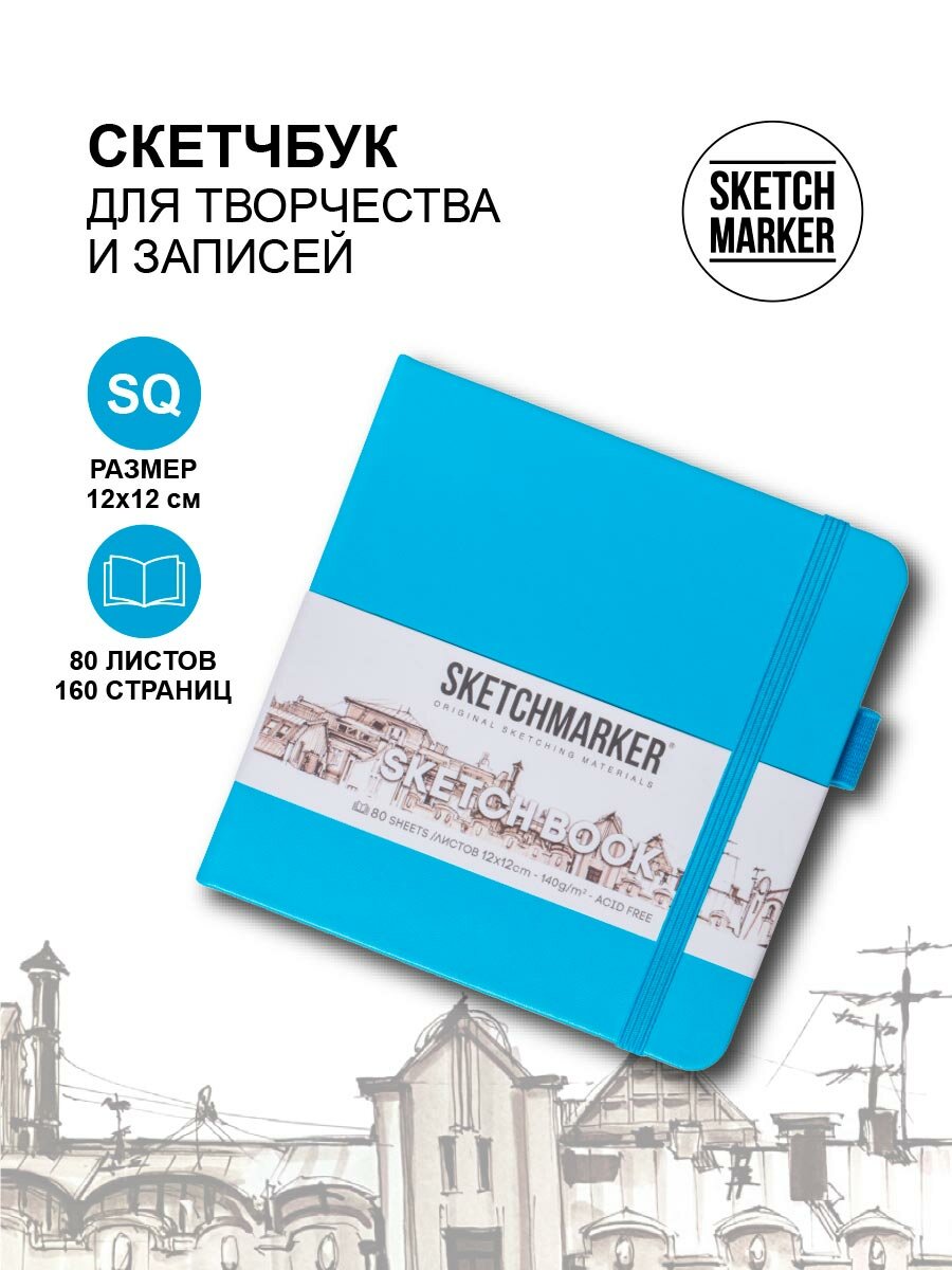 Скетчбук для рисования квадратный, блокнот для скетчинга SKETCHMARKER Sketchmarker 140г/кв.м 12*12см 80л твердая обложка, цвет Небесно-голубой