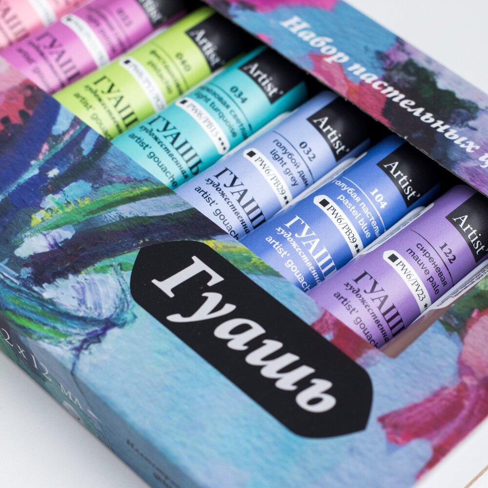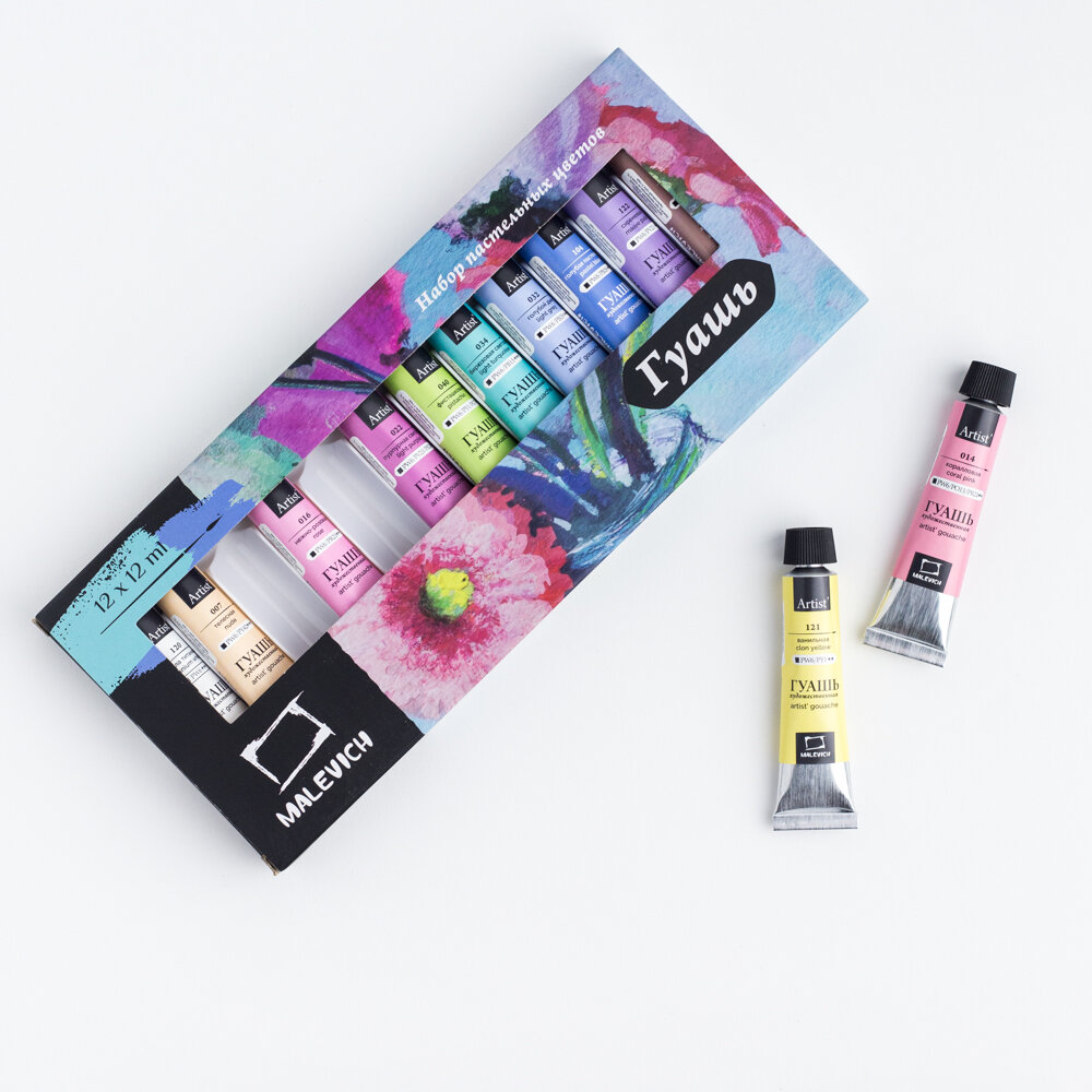 Купить Набор гуаши Малевичъ пастельных цветов, гуашь в тубах 12 цветов по 12мл