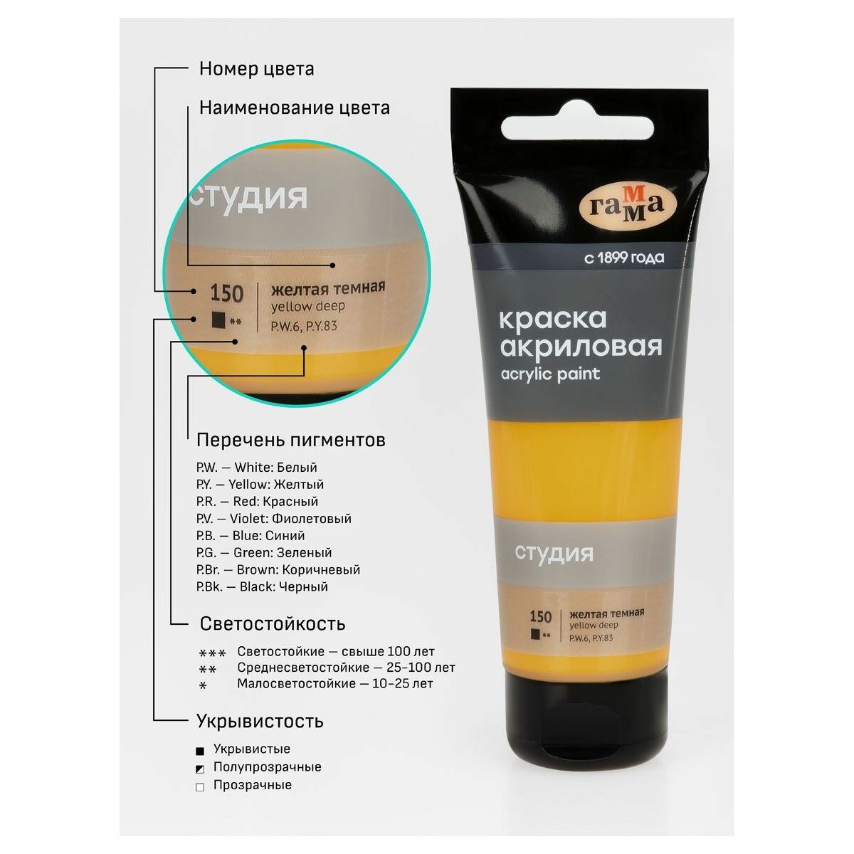 Краска акриловая художественная Гамма "Студия", 75мл, желтая средняя