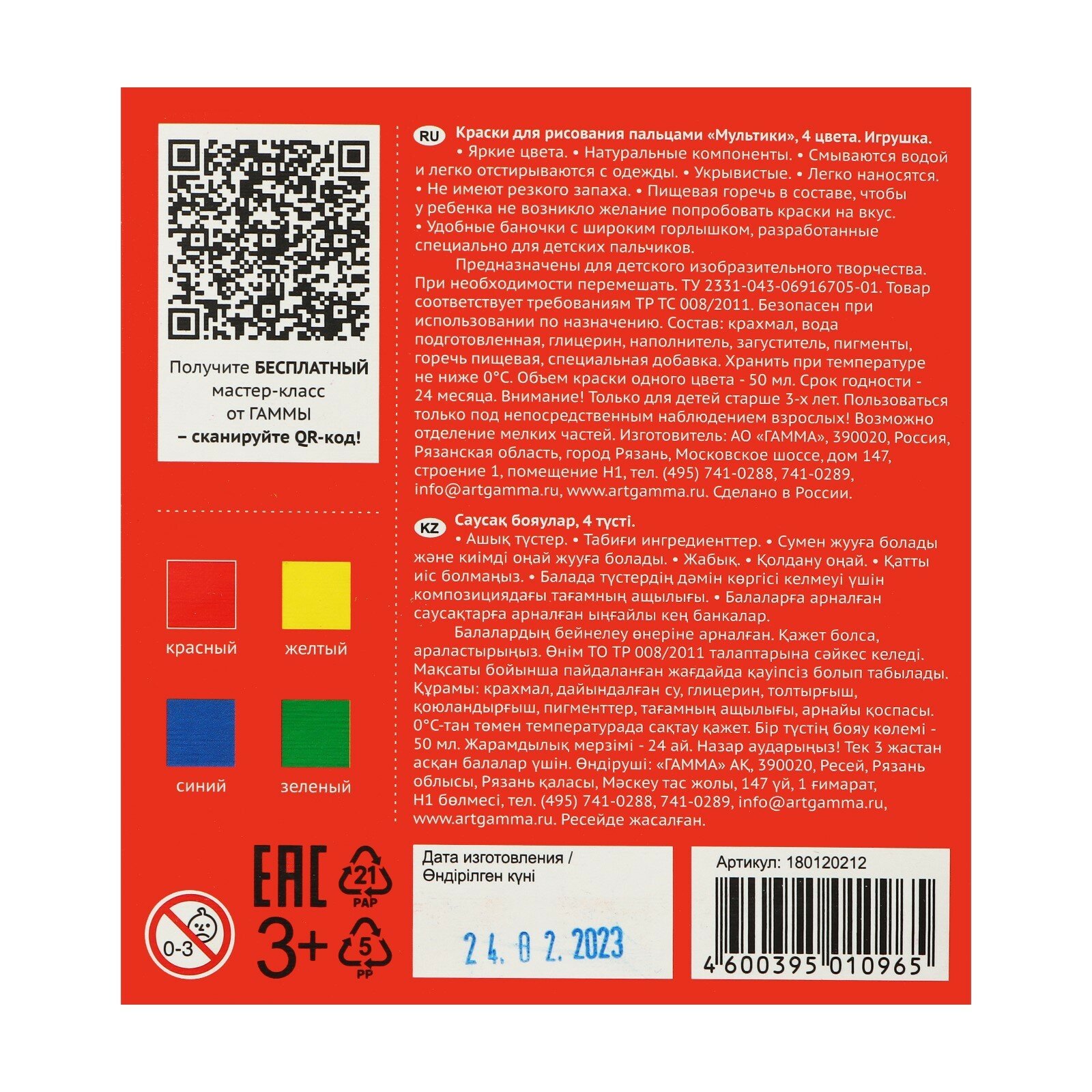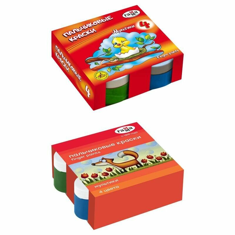 | Комплектация | Краски для рисования Гамма, Мультики, детские, пальчиковые, 4 цвета по 50 мл, 1 уп |