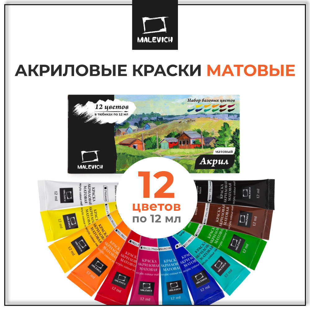Купить Матовые акриловые краски Малевичъ, акрил в тубах, 12 цветов, набор