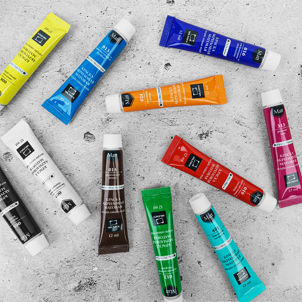 СохранитьМатовые акриловые краски Малевичъ, акрил в тубах, 12 цветов, набор интересное:
