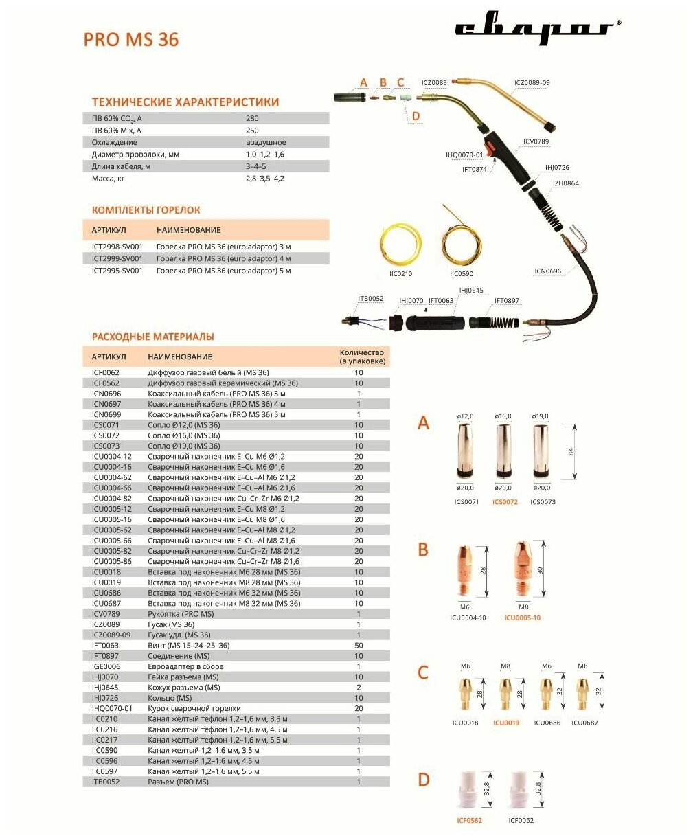 | Подробная комплектация | -сварочная горелка MS 36-1 шт.; -евро адаптер – 1 шт.; -коаксиальный кабель – 1 шт.; -рукоятка в сборе – 1 шт.; -гусак – 1 шт.; -сопло – 1 шт.; -сварочный наконечник – 1 шт.; -канал направляющий – 1 шт.; -диффузор - 1 шт.; -вставка под наконечник - 1 шт. |