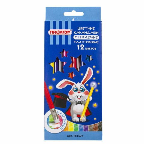 Купить Карандаши цветные стираемые с резинкой пифагор "магия", 12 цветов, пластиковые, 181574