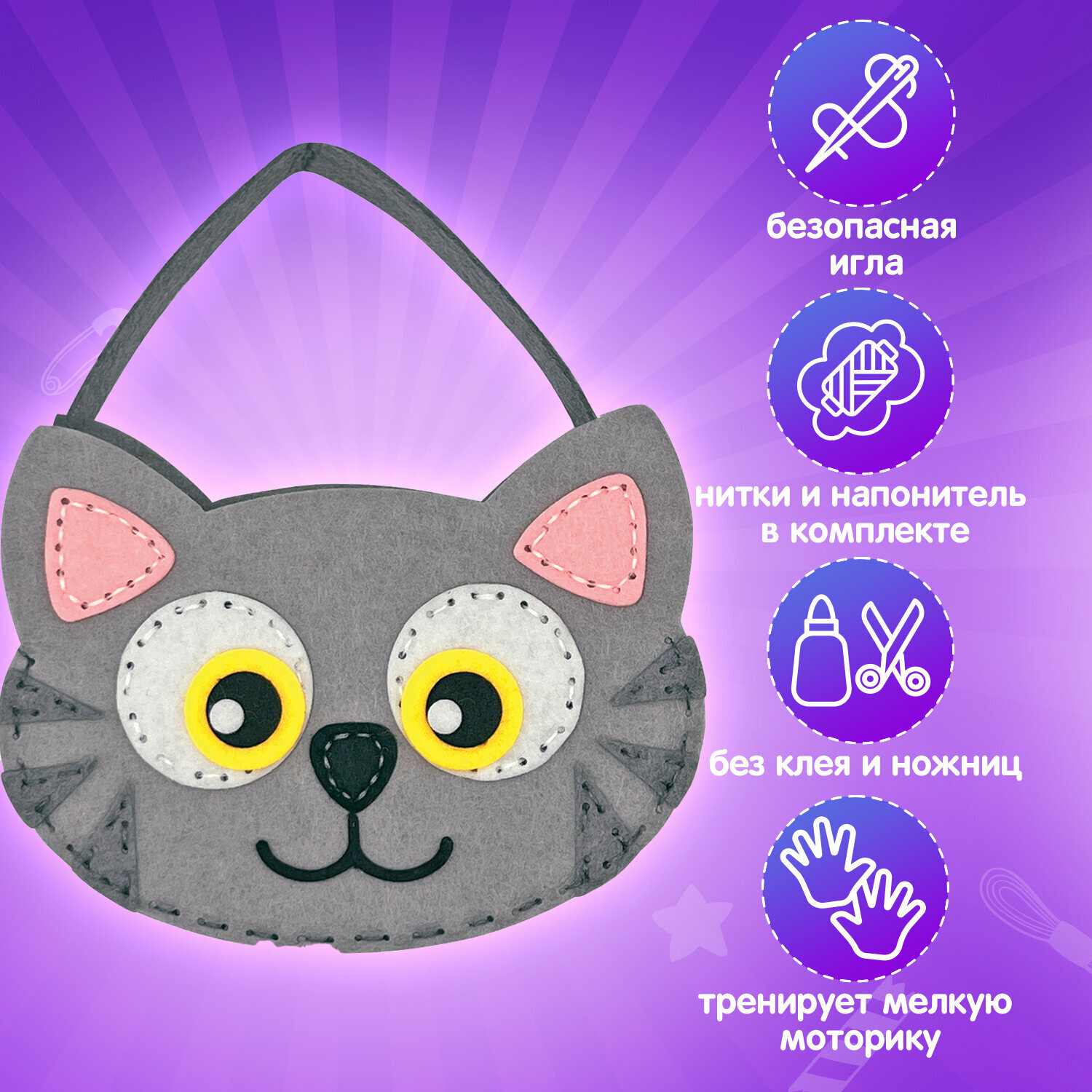 Комплект 10 шт, Набор для шитья сумочки из фетра "Котик", юнландия, 664496