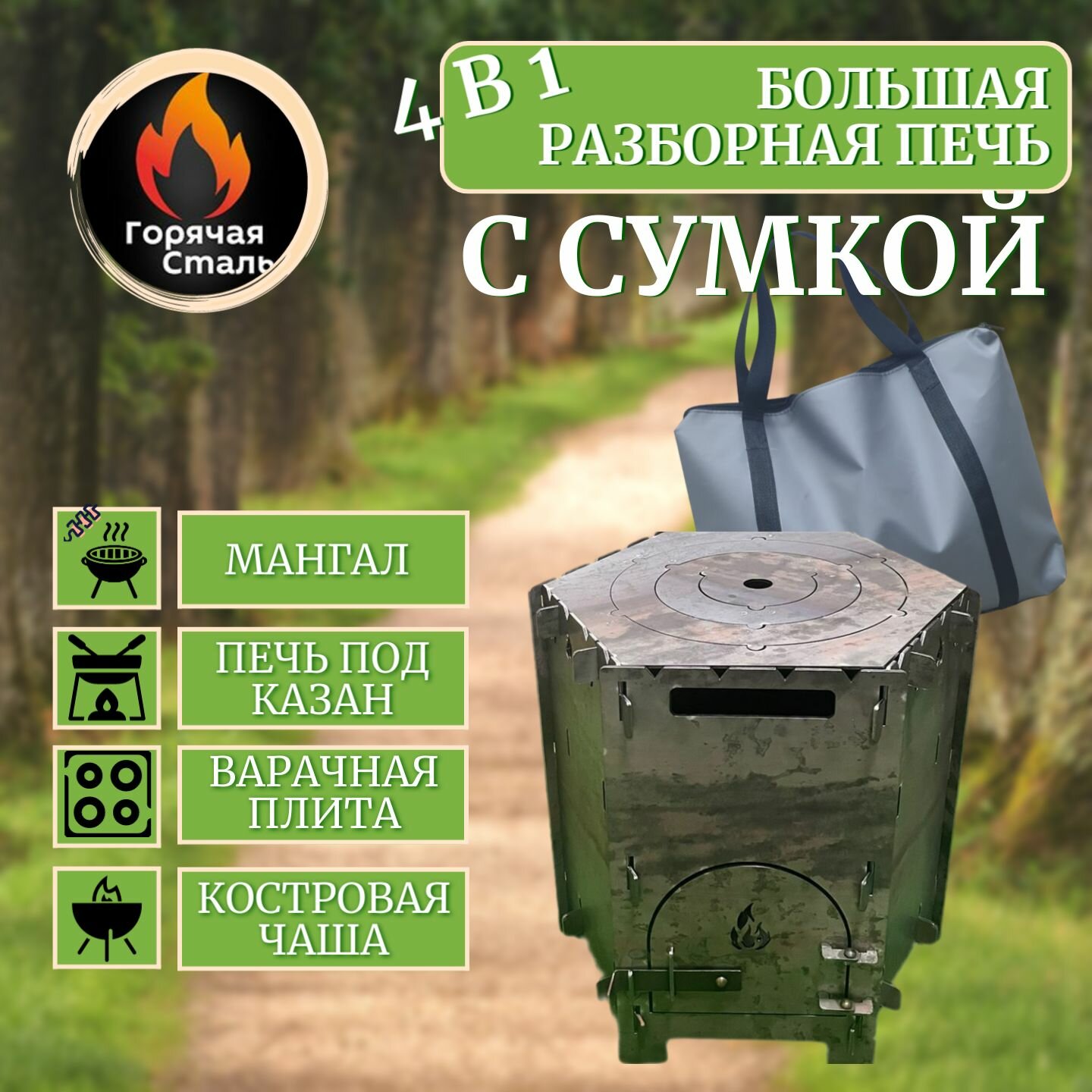 Большая печь мангал с сумкой, костровая чаша, плита 4 в 1 разборная для казана, с дверцей сталь 3 мм.