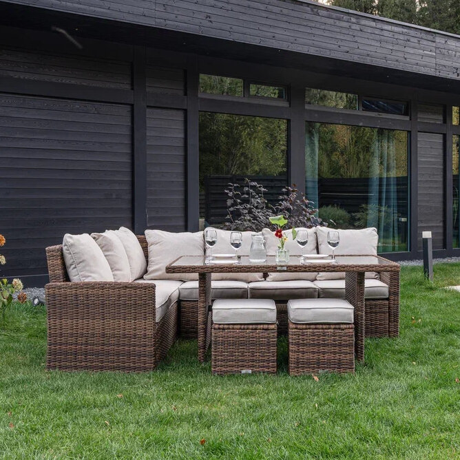| Комплектация | угловой диван, состоящий из двух частей, обеденный стол, 2 пуфа |