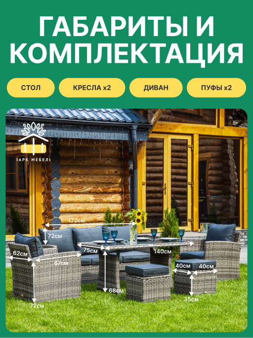| Комплектация | трёхместный диван, обеденный стол, 2 кресла, 2 пуфа |