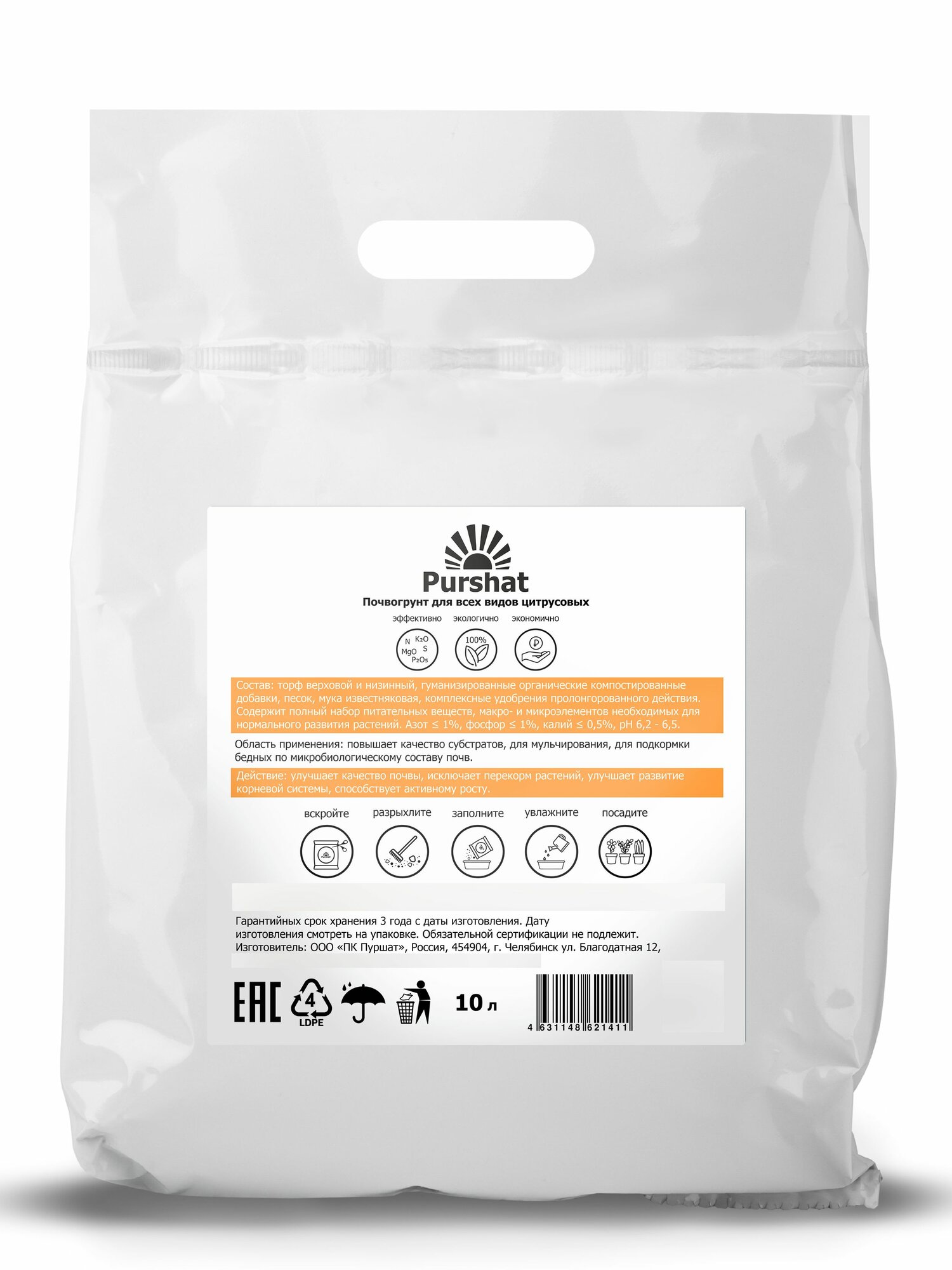 Грунт (земля) для цитрусовых (лимон, мандарин, авокадо) Пуршат. Питательный почвогрунт с торфом и биогумусом (Purshat)10 л