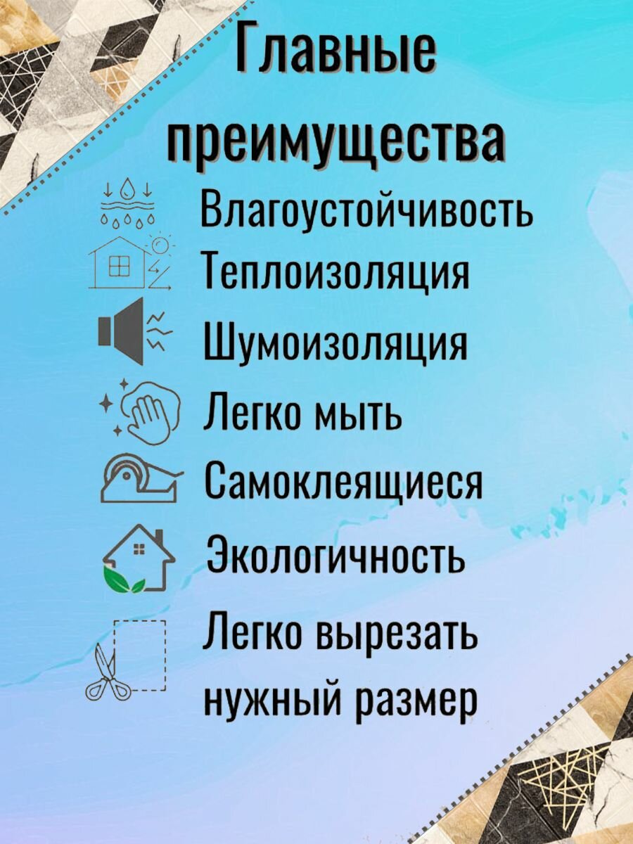 | Дополнительная информация | При использовании в ванной или на кухне рекомендуем обработать стыки герметиком. В зоне прямого попадания воды дополнительно использовать жидкие гвозди; Рядом с плитой используйте защитный экран. Расстояние до открытого огня не менее 50 см; Самоклеящиеся панели можно применять в помещениях с температурой от -15 до +35 градусов. Монтировать панели для стен следует при температуре не ниже +15°С. |