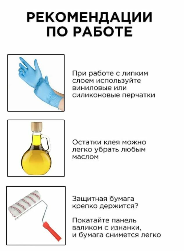 | Дополнительная информация | При использовании в ванной или на кухне рекомендуем обработать стыки герметиком. В зоне прямого попадания воды дополнительно использовать жидкие гвозди; Рядом с плитой используйте защитный экран. Расстояние до открытого огня не менее 50 см; Самоклеящиеся панели можно применять в помещениях с температурой от -15 до +35 градусов. Монтировать панели для стен следует при температуре не ниже +15°С. |