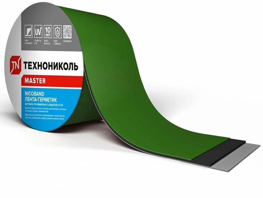 Лента-герметик ТехноНиколь NICOBAND, самоклеящаяся 3м х 10см, Зеленая, для пластика/ бетона/ металла/ дерева