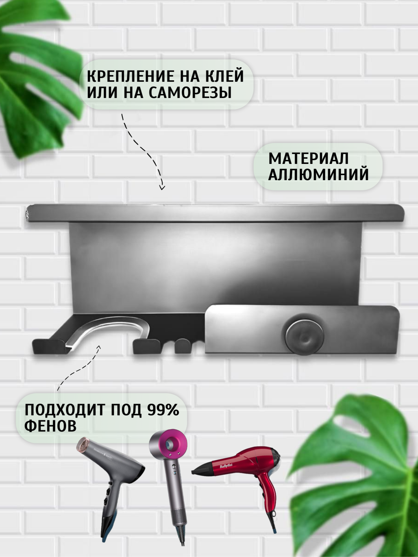 СохранитьПолка для фена bLESkYOU, алюминий, СЕРЫЙ, влагостойкий, настенный, без сверления, с крючком . интересное: