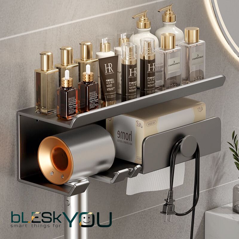 Держатель для фена bLESkYOU, серый, без сверления, с крючком с органайзером, пластик, 22х9х9 см, настенный, самоклеящийся. 1 шт.