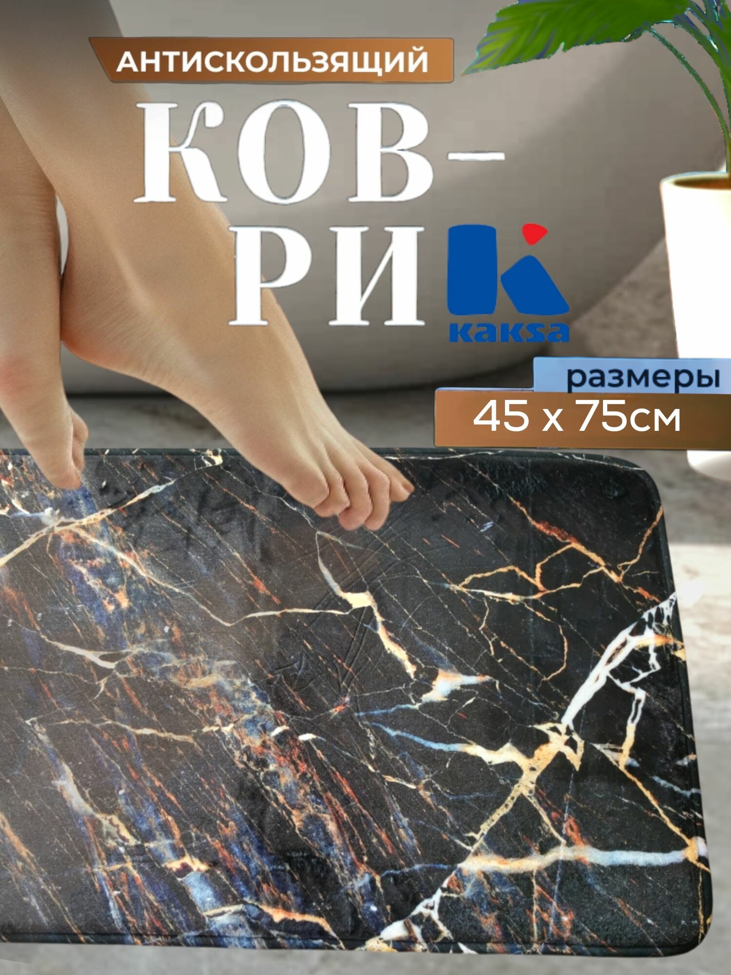 Коврик для ванной "Мрамор черный" (ВТ47-МАТ) 45х75 см, Kaksa противоскользящий, камень
