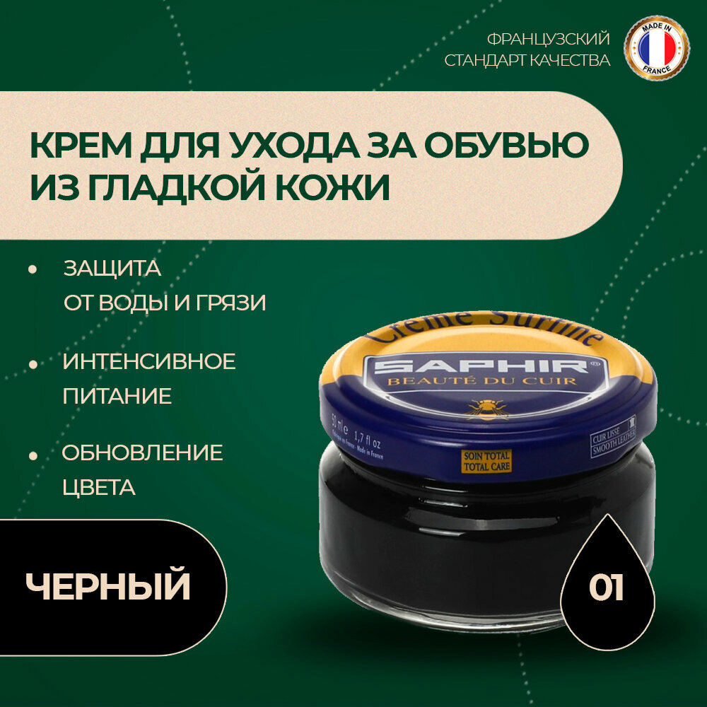 Купить Крем Saphir Creme Surfine для обуви из гладкой кожи 50 мл, цвет 01 черный