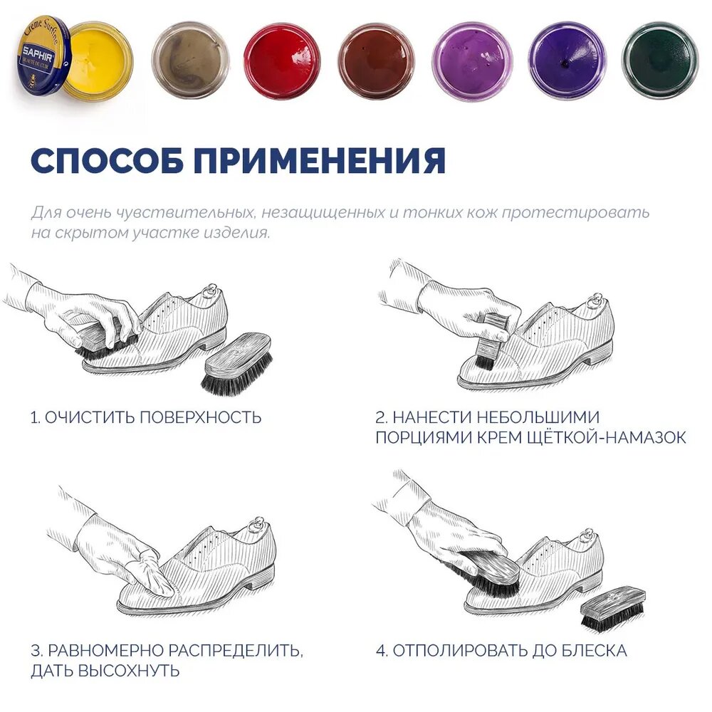 | Дополнительная информация | крем высшего качества серо-белого цвета на основе натурального пчелиного воска (32%), миндального масла и еще более 6-и различных минеральных восков. Имеет большое содержание пигментов. Не содержит воды. Питает кожу, интенсивно насыщает и обновляет цвет, придает водоотталкивающие свойства и стойкий блеск. После нанесения дать впитаться, подождать 5-10 минут и отполировать полировочной салфеткой для придания блеска |