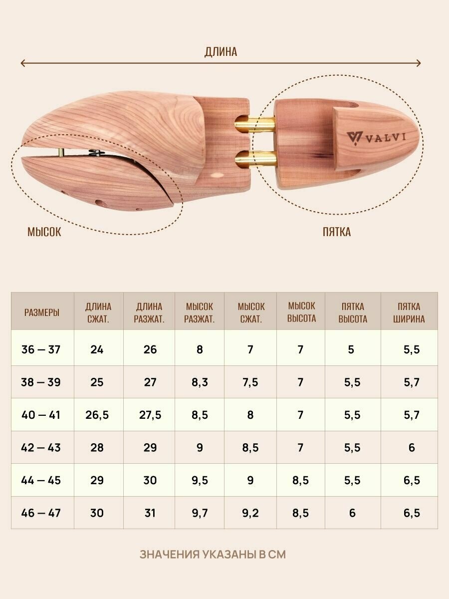 | Дополнительная информация | Длина в разжатом состоянии 32 см., в сжатом состоянии 30 см. Подберите необходимый размер, вставьте в обувь, формодержатель должен обеспечивать легкое натяжение для заполнения обуви по длине и ширине за счет встроенных пружин. Ароматические кедровые деревья 100% премиум класса защищают кожу и ткань от влаги. Европейское полное кедровое дерево: контурная подошва - разработана для сохранения первоначальной формы обуви и предотвращения образования складок, нагруженных натяжением двойных трубок и регулируемого шплинта Крюк для пятки для легкого снятия, широкий каблук для поддержания каблука в первоначальном виде Впитывает влагу и запах и придает обуви свежий кедровый аромат Подходит для всех типов обуви на плоской подошве, особенно подходит для классической обуви и оксфордов |