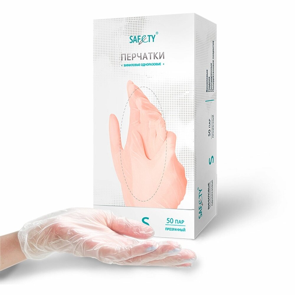Перчатки виниловые SAF&TY смотровые, 50 пар, размер S, прозрачные