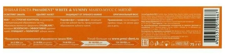 Купить Зубная паста PRESIDENT White & Yummy Манго-мусс с мятой, 75 г
