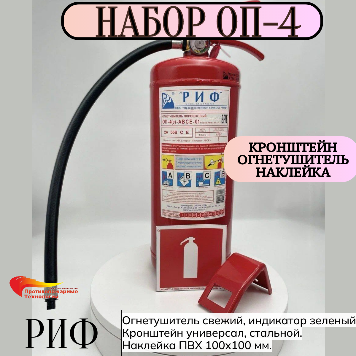 Набор из огнетушителя ОП-4 ABCE ЗПУ РИФ, кронштейна универсального и наклейки F04 "Огнетушитель"