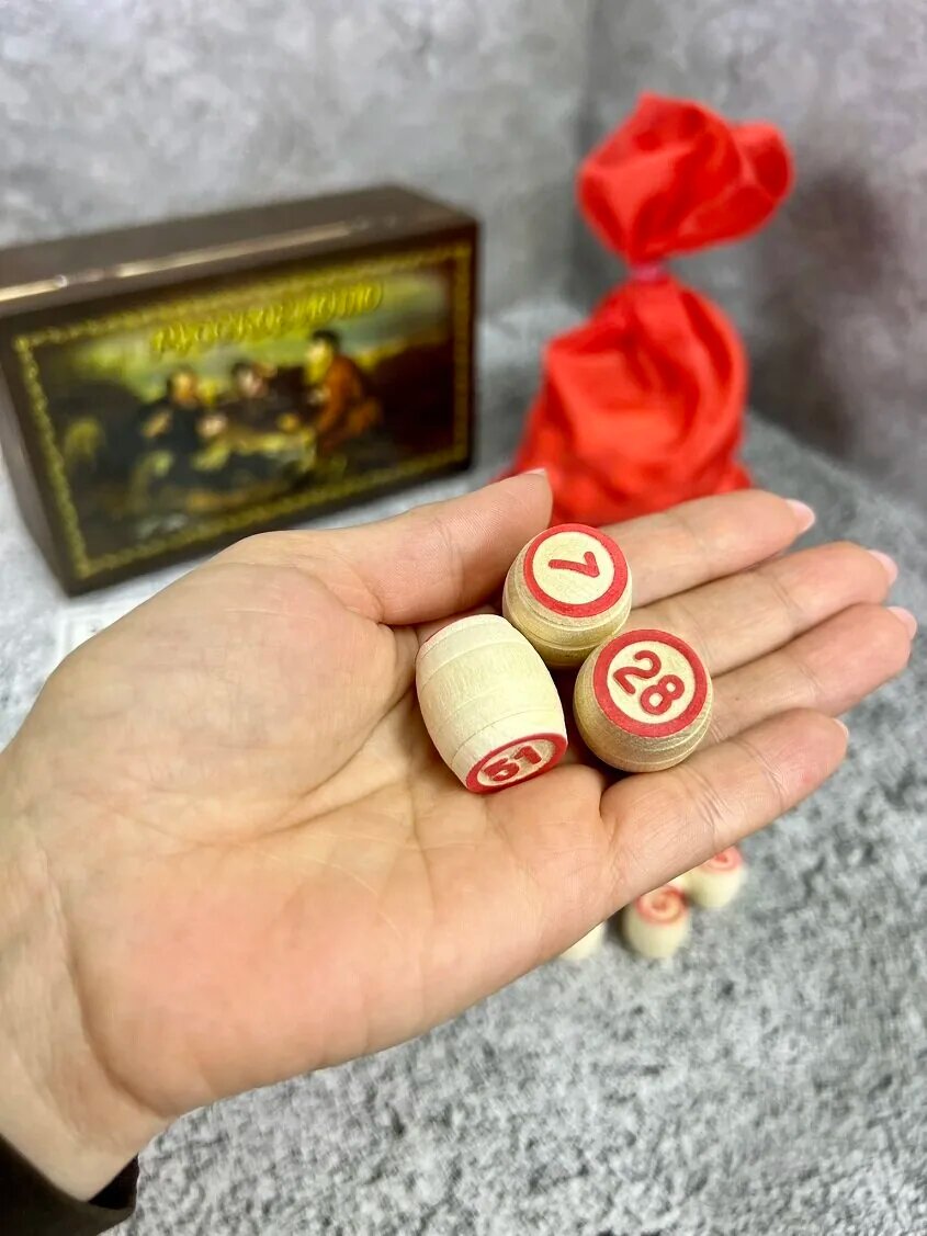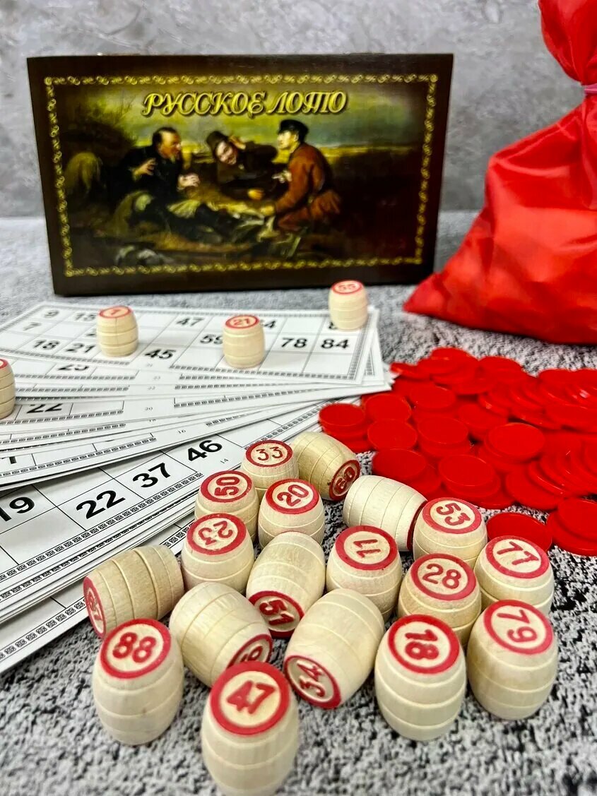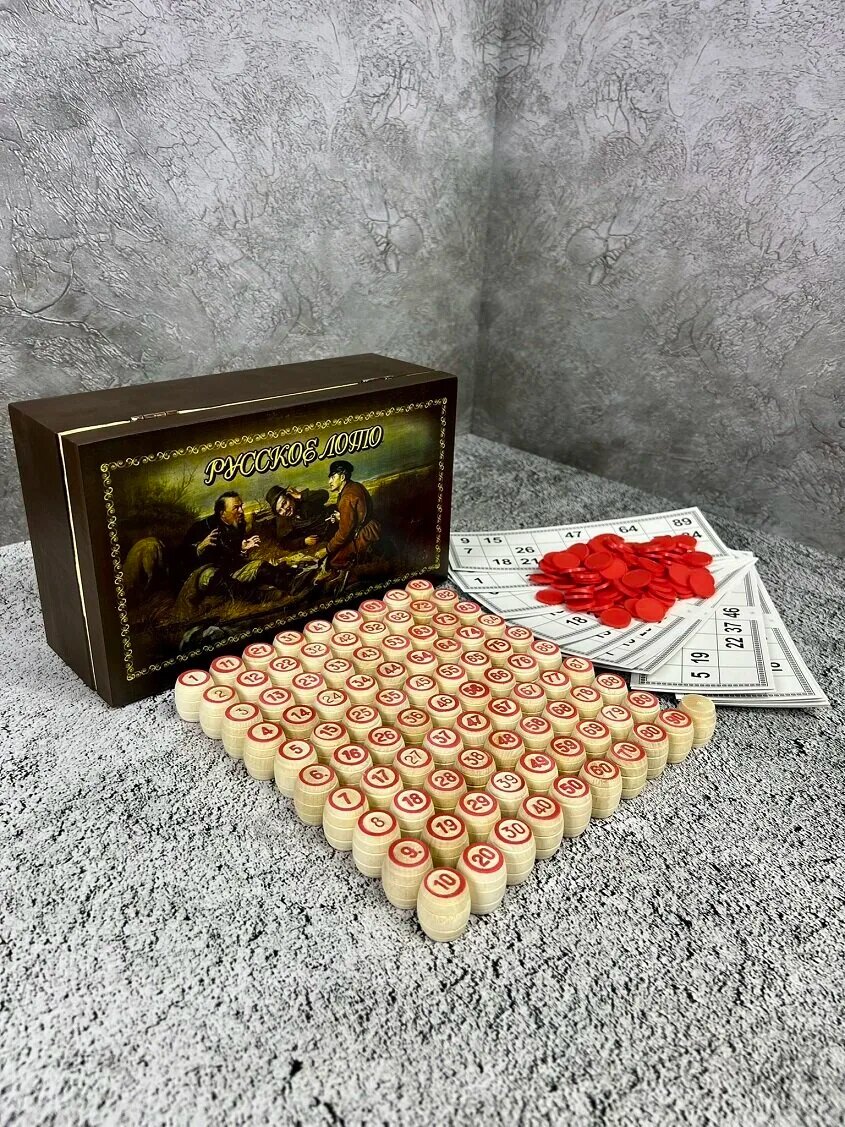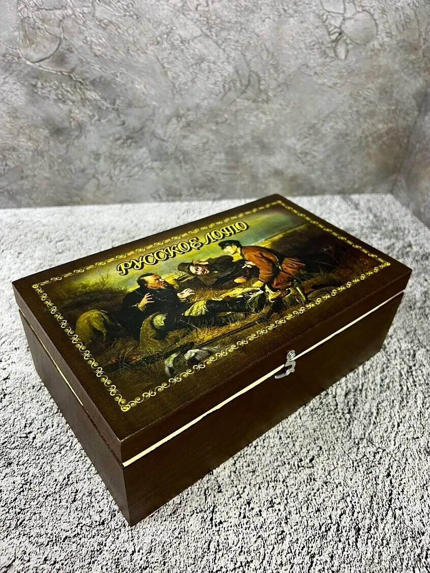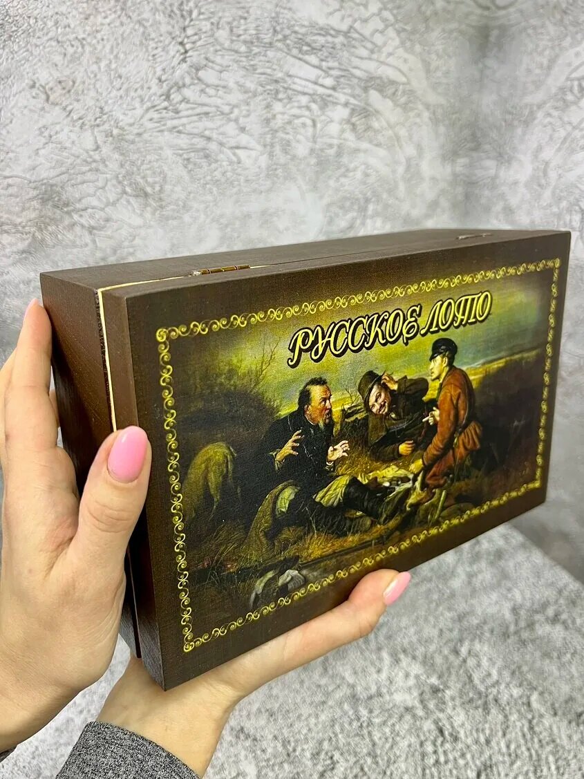 Русское лото "Охотники на привале" цветное в деревянной шкатулке 25х15х10 см интересное: