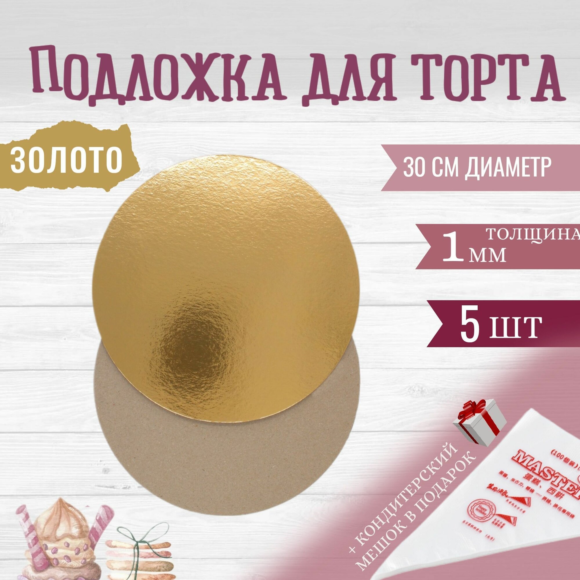 | Комплектация | 5 подложек , золото/белый жемчуг, диаметр 26см, толщина 1,5мм + кондитерский мешочек |