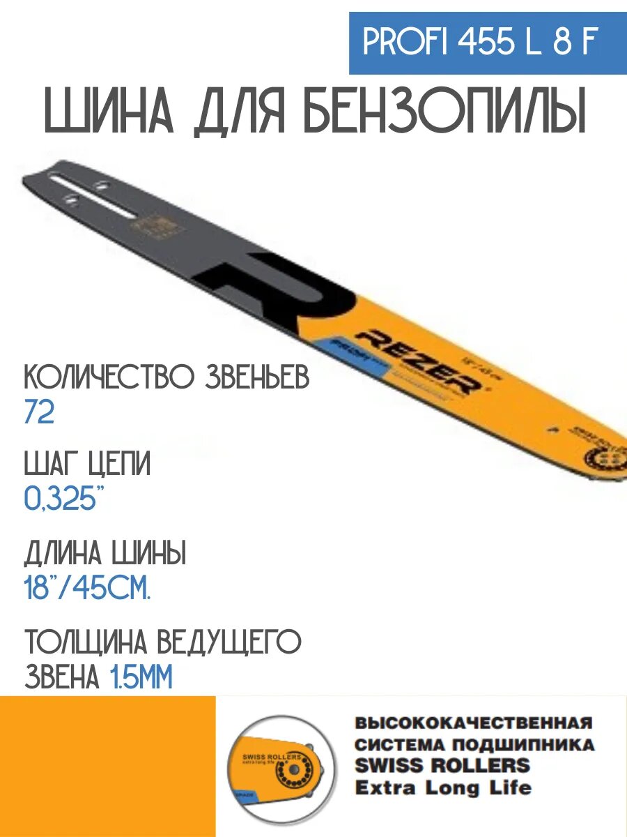 Rezer PROFI 455 L 8 F Шина для бензопилы Carver 45-18, Forward, Patriot, BGT, 72 звена, длина шины 18"( 45 см) , шаг 0.325", ширина паза 1.5 мм