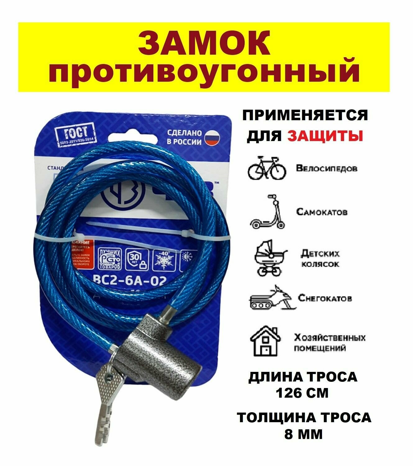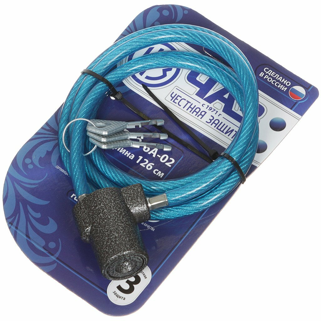 Велосипедный тросовый замок ВС2-6А-02, алюминиевый корпус, длина троса 1260 мм, 3 ключа в комплекте, производство Россия