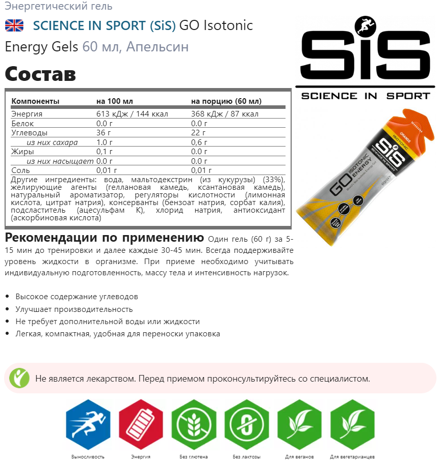| Дополнительная информация | назначение: для обеспечения дополнительного топлива в течение длительных и интенсивных физических нагрузок; рекомендации по применению: Один гель каждые 30-40 минут, не более 3 гелей в час. Не требует дополнительного приема жидкости. Возможно чередование с SiS GO Energy + Electrolyte Gel и сочетание с изотоническим напитком SiS Hydro.; форма выпуска: Гель; состав: вода, мальтодекстрин (из кукурузы), гелеобразующие агенты (геллановая камедь, ксантановая камедь), натуральный ароматизатор, регуляторы кислотности (лимонная кислота, цитрат натрия), консерванты (бензонат натрия, сорбат калия), подсластитель (ацесульфам К), хлорид натрия, антиоксидант (аскорбиновая кислота) |