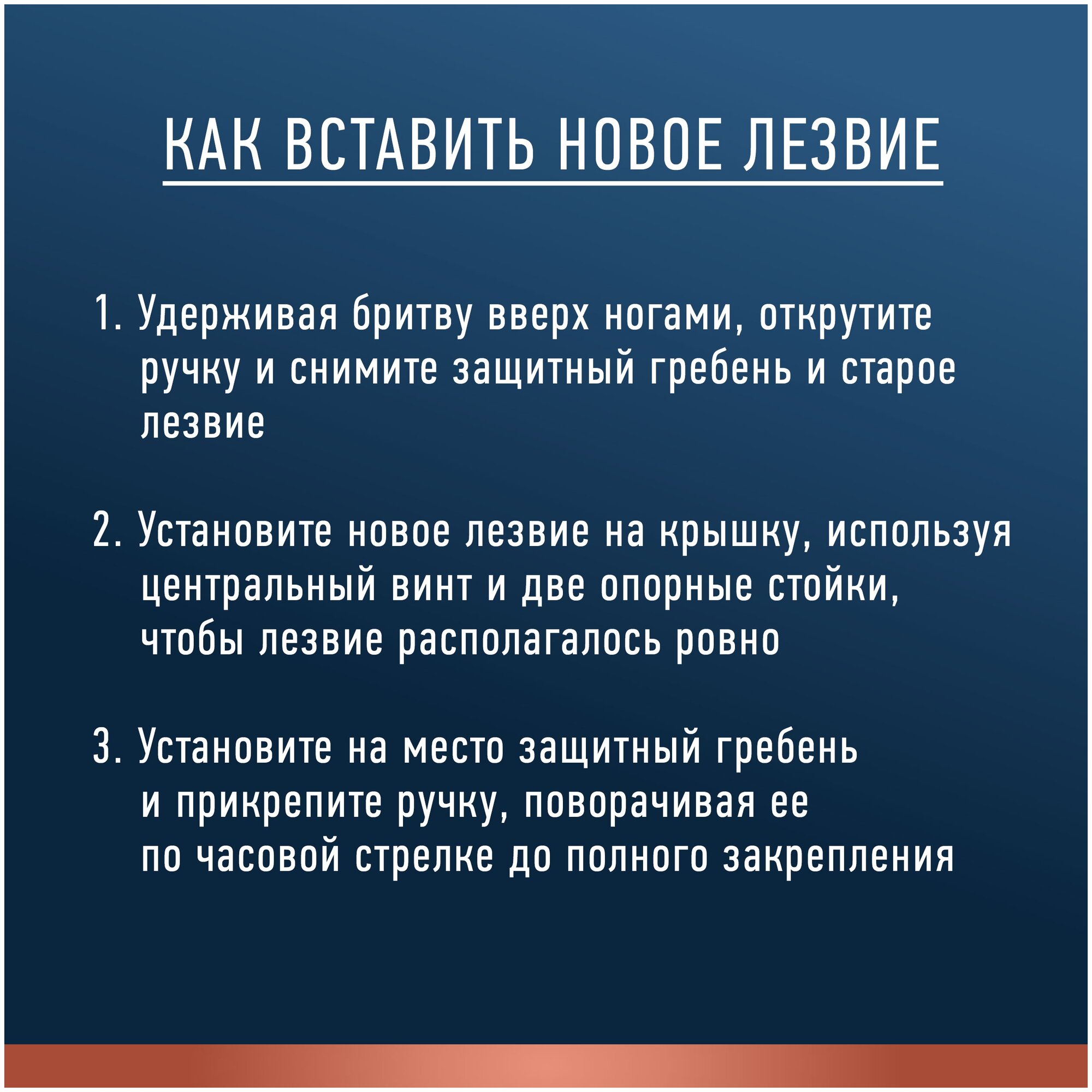 | Дополнительная информация | как вставить новое лезвие: 1.Удерживая бритву вверх ногами, открутите ручку и снимите защитный гребень и старое лезвие 2. Установите новое лезвие на крышку, используя центральный винт и две опорные стойки, чтобы лезвие располагалось ровно 3. Установите на место защитный гребень и прикрепите ручку, проворачивая ее почасовой стрелке до полного закрепления |