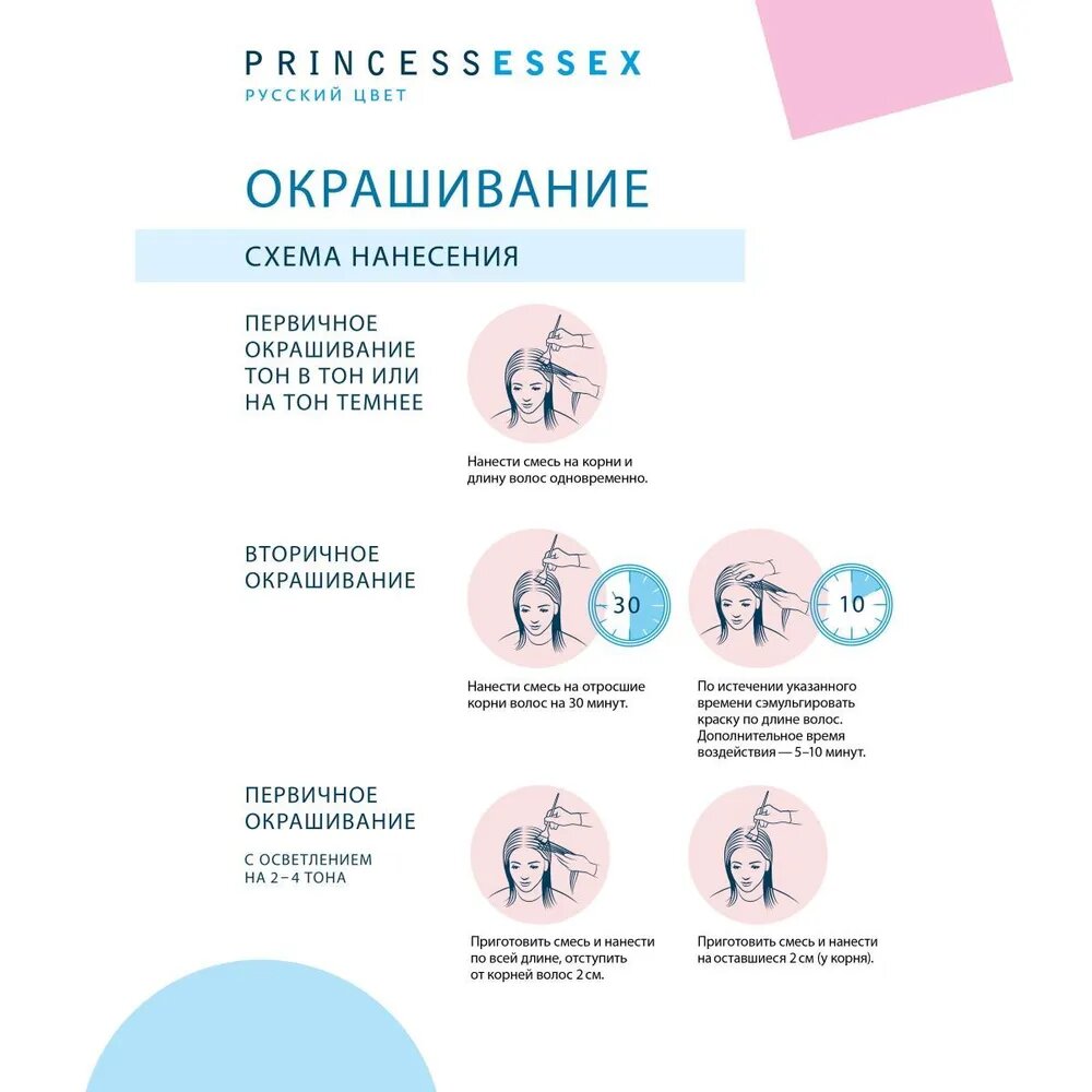 | Способ применения | смешивается с оксигентами PRINCESS ESSEX 3, 6, 9 % в соотношении 1:1 и с активатором PRINCESS ESSEX 1,5 % в соотношении 1:2 |