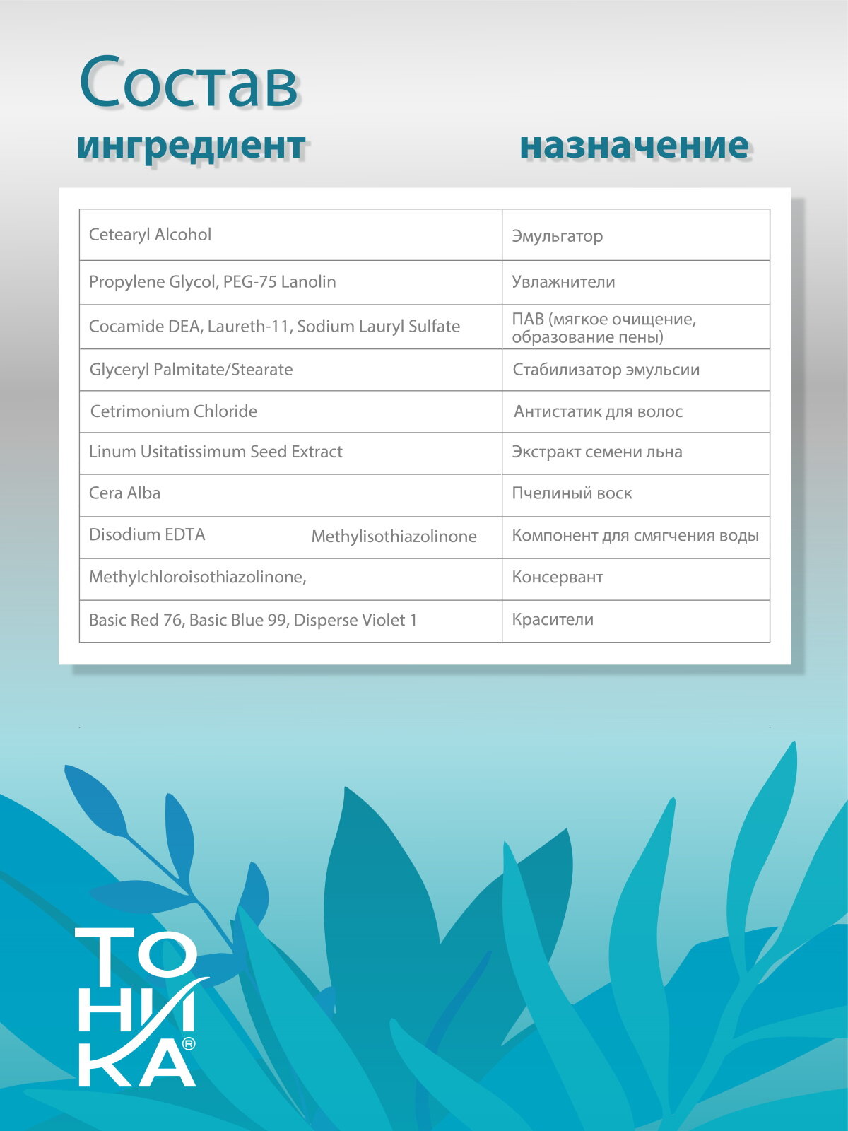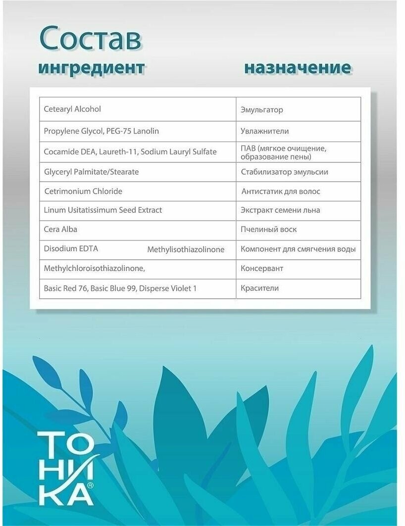 | Состав | Aqua, Cetearyl Alcohol, Propylene Glycol, Ceteareth-23, Cetrimonium Chloride, Linum Usitatissimum Seed Oil, Linum Usitatissimum Seed Extract, Disodium EDTA, Citric Acid, Methylchloroisothiazolinone, Methylisothiazolinone, Parfum, Basic Red 76, HC Blue No 15, Basic Yellow 57. |