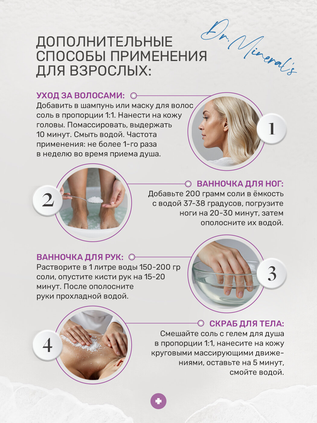 | Способ применения | принятие ванны: Перед принятием ванны рекомендуется выпить стакан воды или травяного чая. 500 грамм английской соли «Epsom» растворить в ванной при температуре 37-38 градусов. Принимать ванну 20-30 минут не погружаясь глубже линии сердца на длительное время. После принятия ванны ополоснуться водой. Рекомендуется принимать ванны 2-3 раза в неделю. |