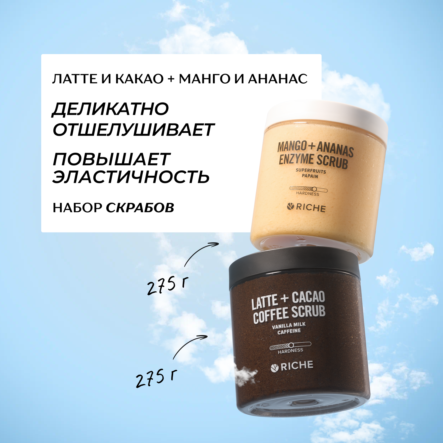 СохранитьRICHE Набор антицеллюлитных скрабов для тела: Латте-Какао + Манго-Ананас интересное: